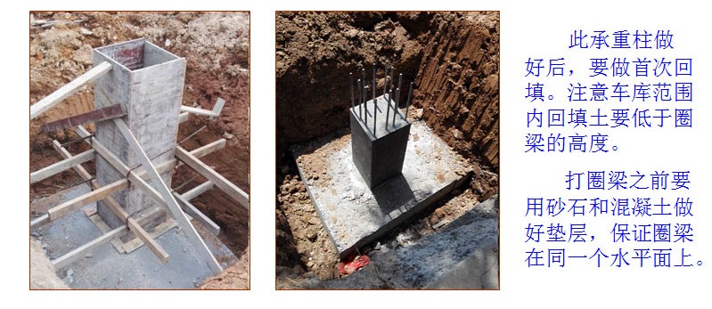 此承重柱連接承臺和地面圈梁,注意首次澆筑混凝土,要預留出大于車庫立柱預埋件底腳高度的鋼筋,以方便預埋件的調整和固定。